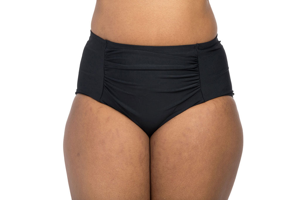 Our High Waisted Bottom sits just above the navel for a cinching effect on the waist. It is high rise with full coverage on the bottom. Fabric ruching on the front panel is flattening and flattering. It is comfortable , trustworthy and reliable - a confidence booster. Available in sizes 4-18.